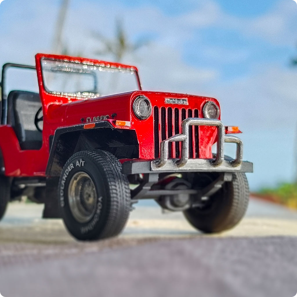 The 3D-printed Mahindra Classic Jeep model combines the nostalgia of vintage off-roaders with the precision of modern 3D printing technology. Perfect for collectors and Jeep enthusiasts, this model reminds them of the original vehicle’s adventurous legacy while providing a convenient, compact version of the Classic Jeep. Whether displayed on a desk or added to a model collection, our miniature Mahindra Classic captures the heart and heritage of a true off-roading legend.